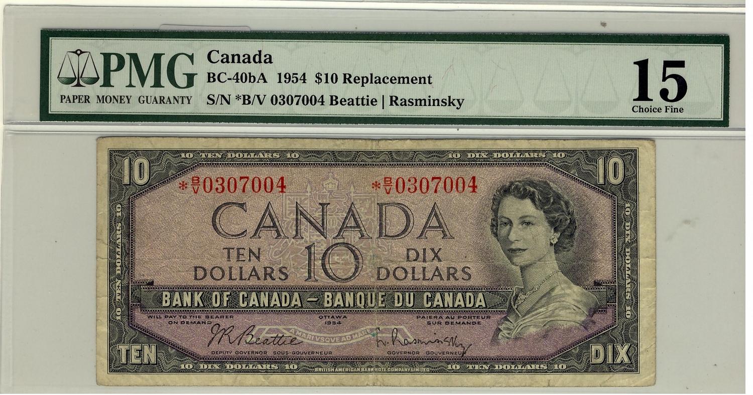 1954 $10 BC-40bA #*BV0307004. PMG F15. Scarcer prefix.