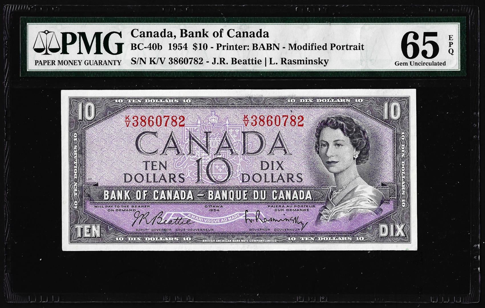 One 1954 $10 Bank of Canada Note BC-40B PMG Gem Uncirculated 65EPQ. PMG Certified.