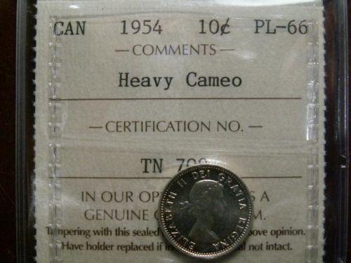 1954 10¢ ICCS PL66 HEAVY CAMEO. Full luster with reflective surfaces. Scarce so nice!