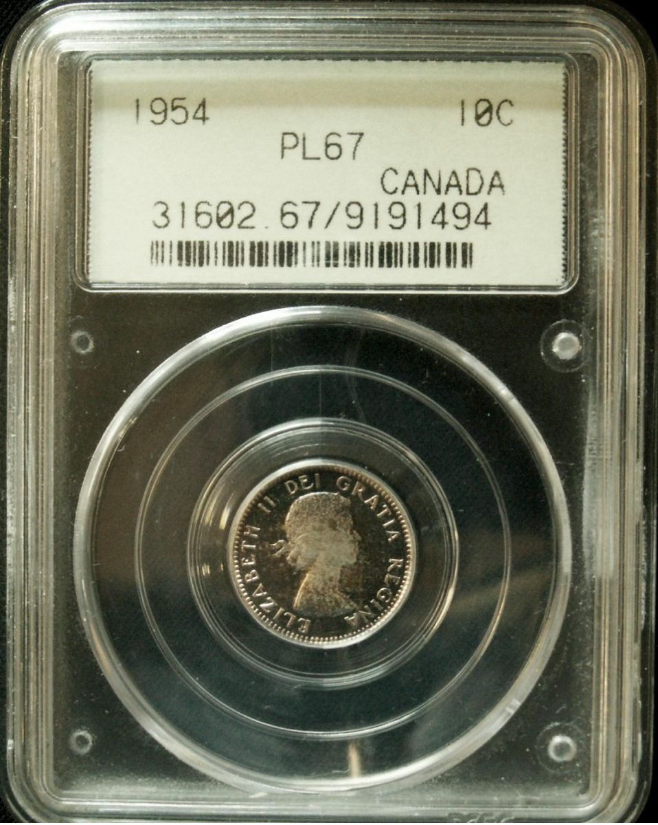 1954 10¢ PCGS PL67. Gem toning and eye appeal. Only 4 examples finer.