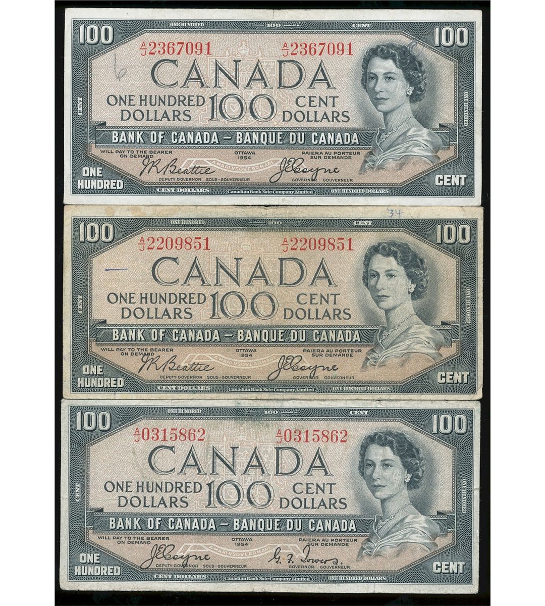 1954 $100 BC-35a & BC-35b(2). Lot of 3 notes VG to VF with minor staining and issues.