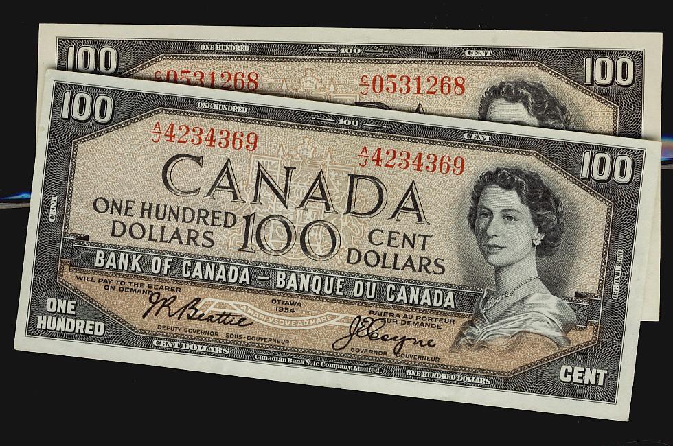 1954 $100 BC-43. Lot of two notes including BC-43a #AJ4234369 and BC-43c #CJ0531268. EF-AU