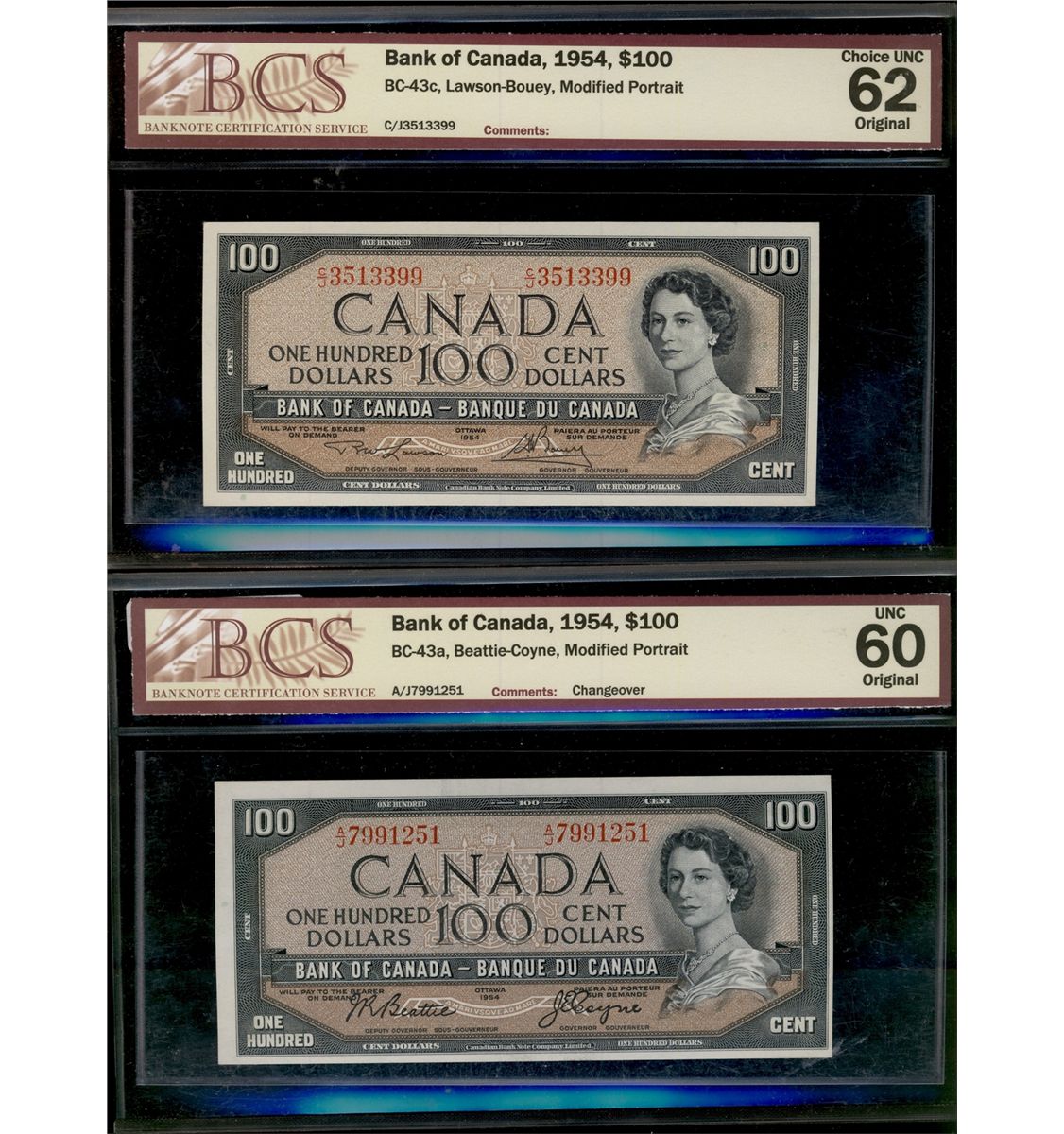 1954 $100 BC-43a #AJ7991251 UNC60 & BC-43c #CJ3513399 CH UNC62. Lot of 2 notes graded BCS.