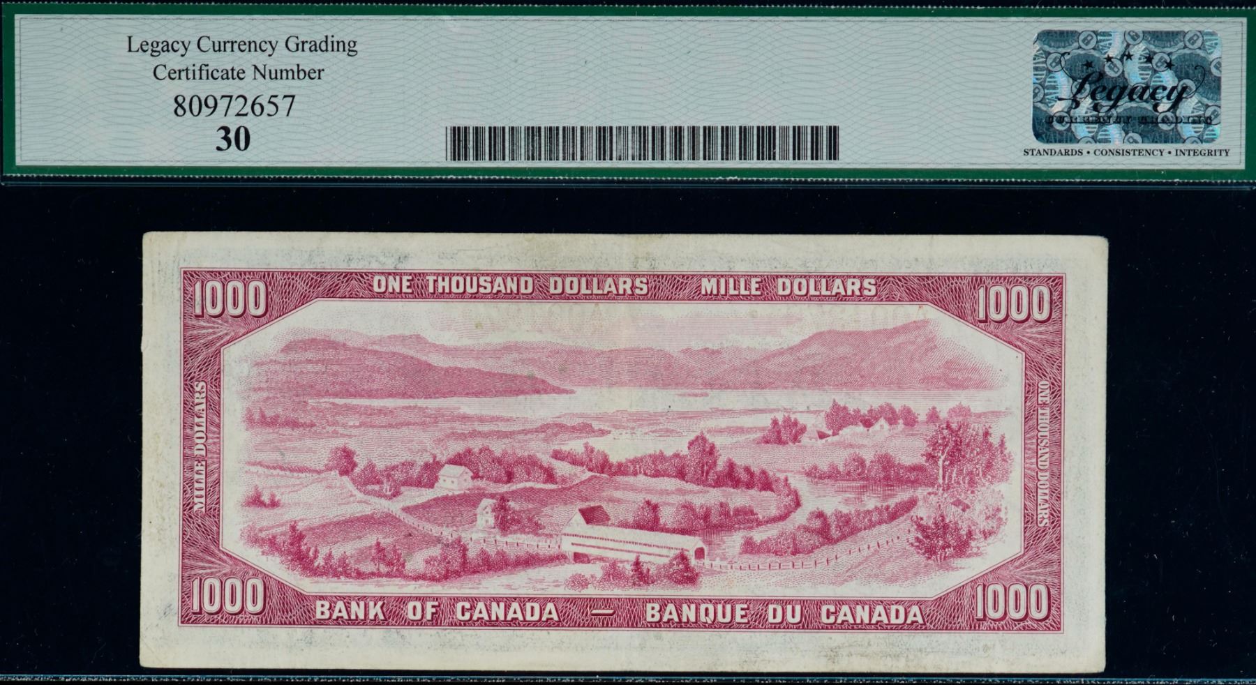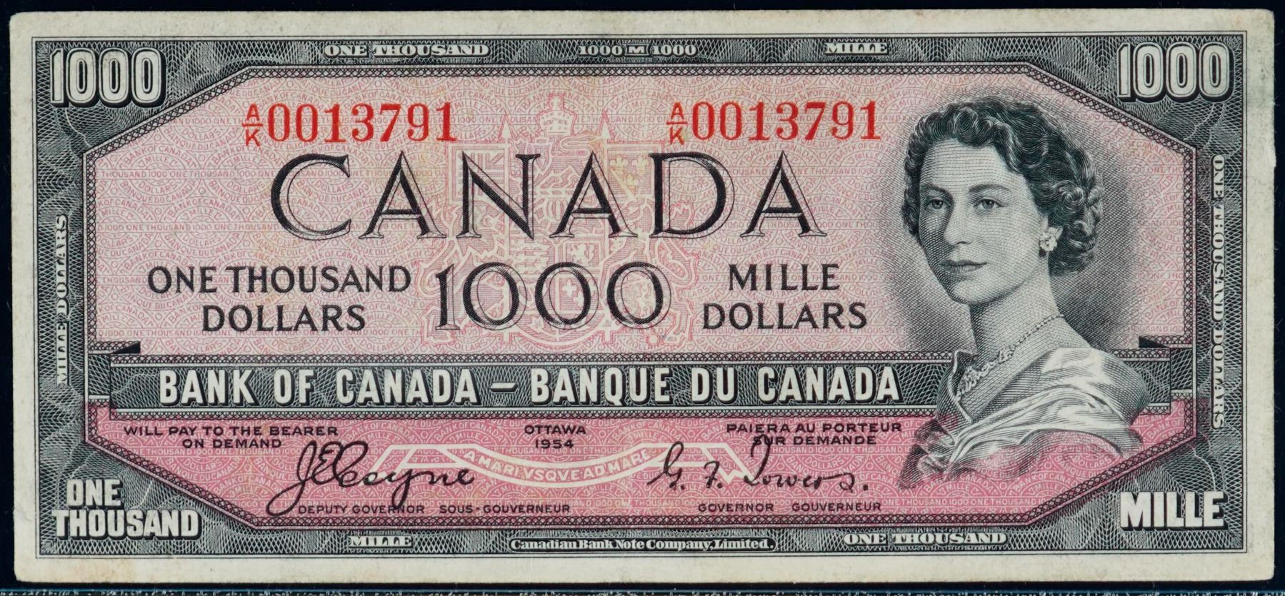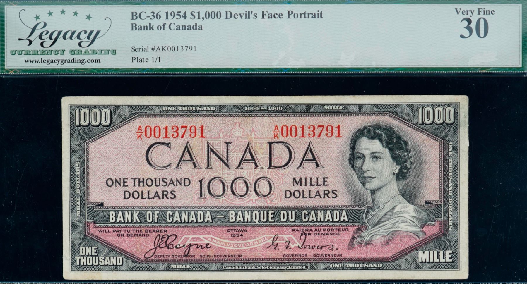 1954 $1000 BC-36 #A/K0013791 Legacy Choice Very Fine-30. A bright and attractive example. Rare and sought-after Devil's face banknote.