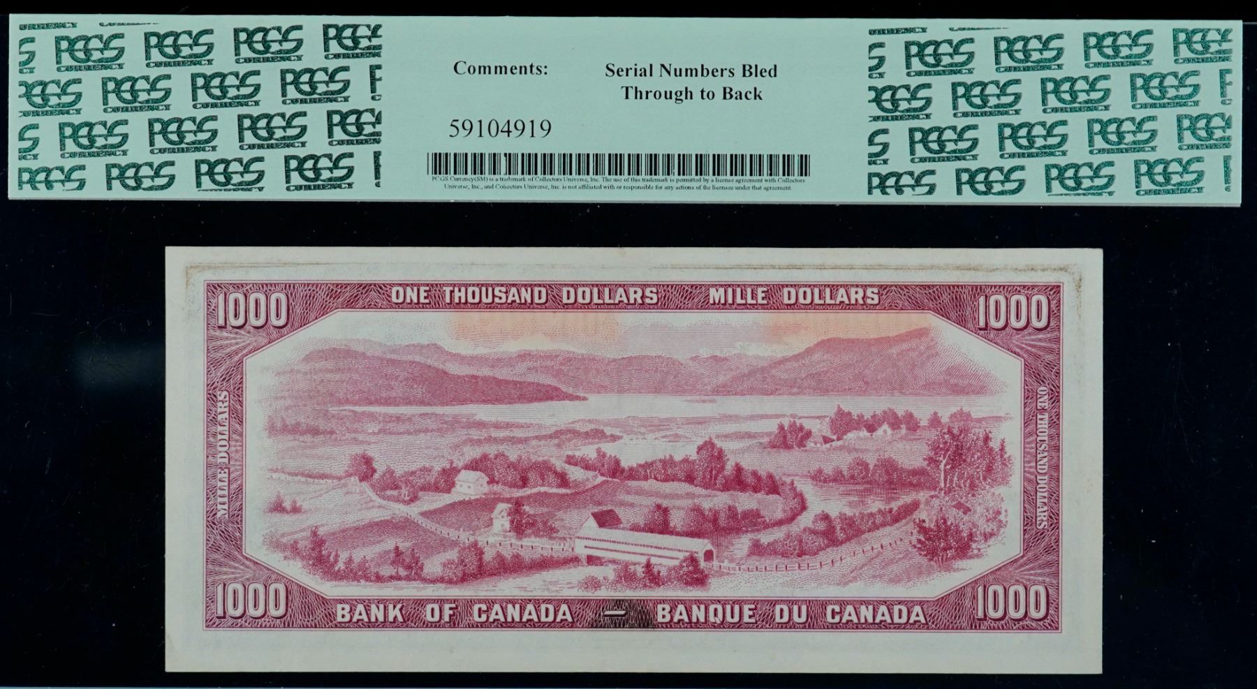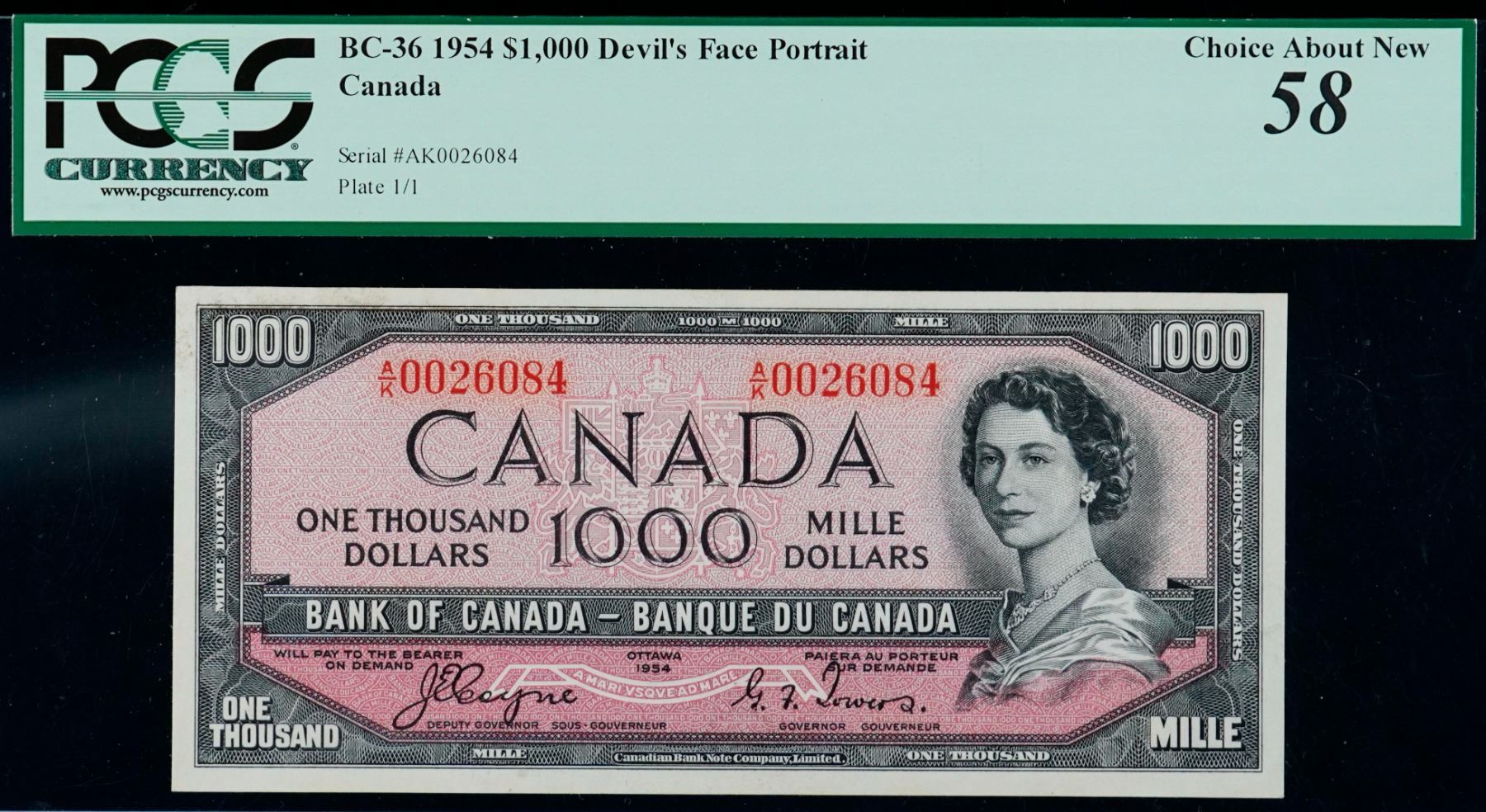 1954 $1000 BC-36 #A/K0026084 PCGS Choice About Uncirculated-58. Serial numbers bled through to back. A nice example of this rare $1000 bill with the devil's face portrait. Nice eye appeal and good margins. This would be an important addition to a major highlight of a personal collection. Worth a premium bid.