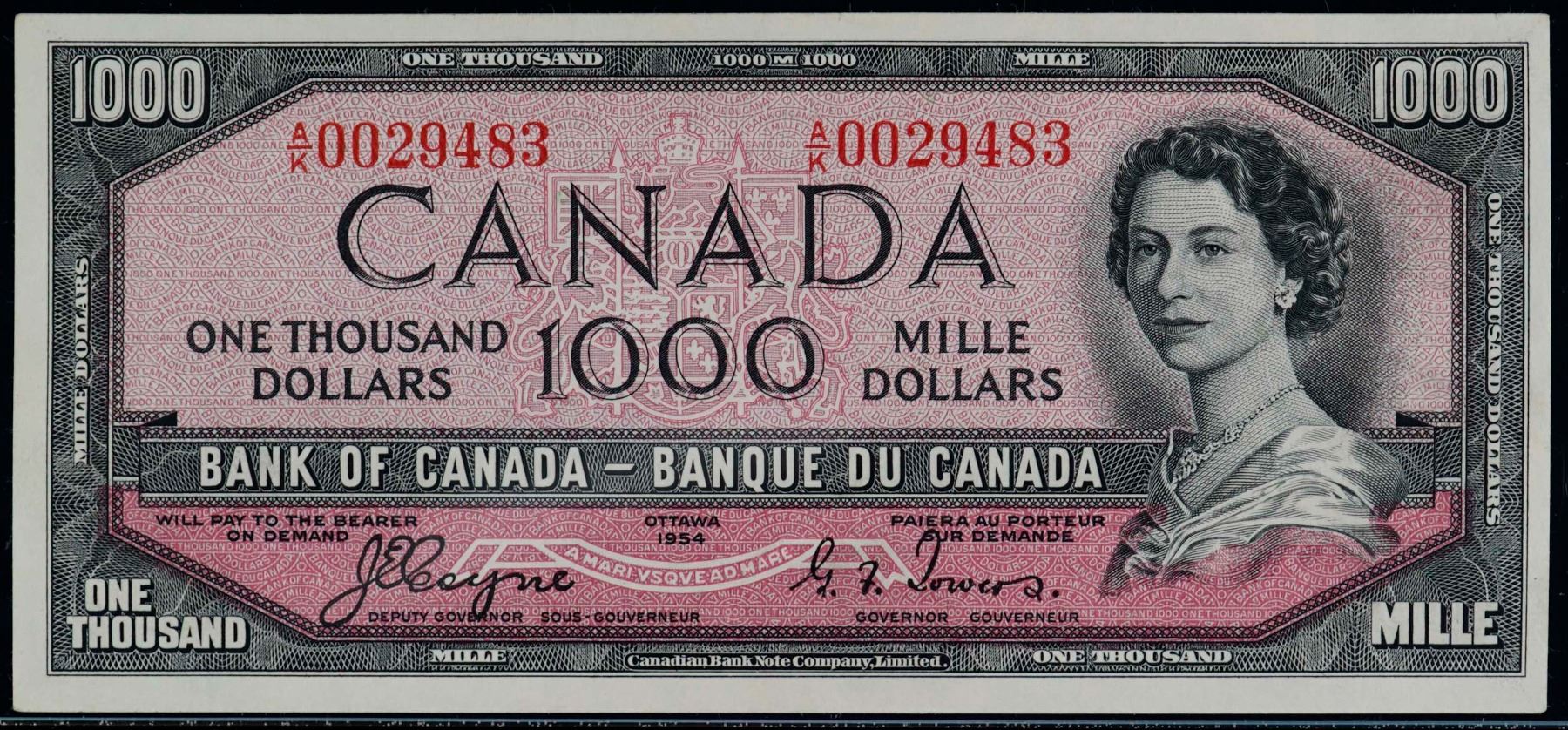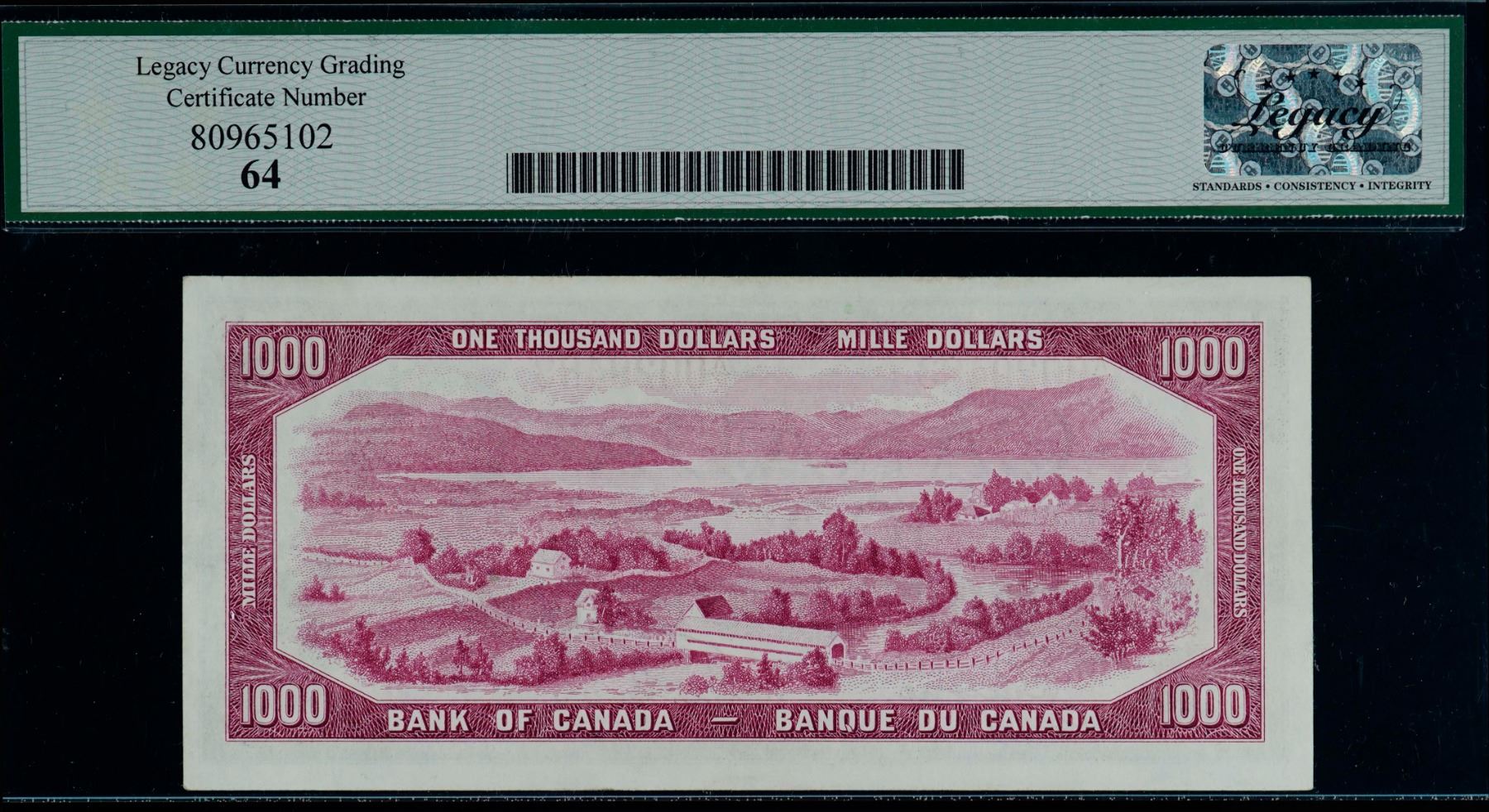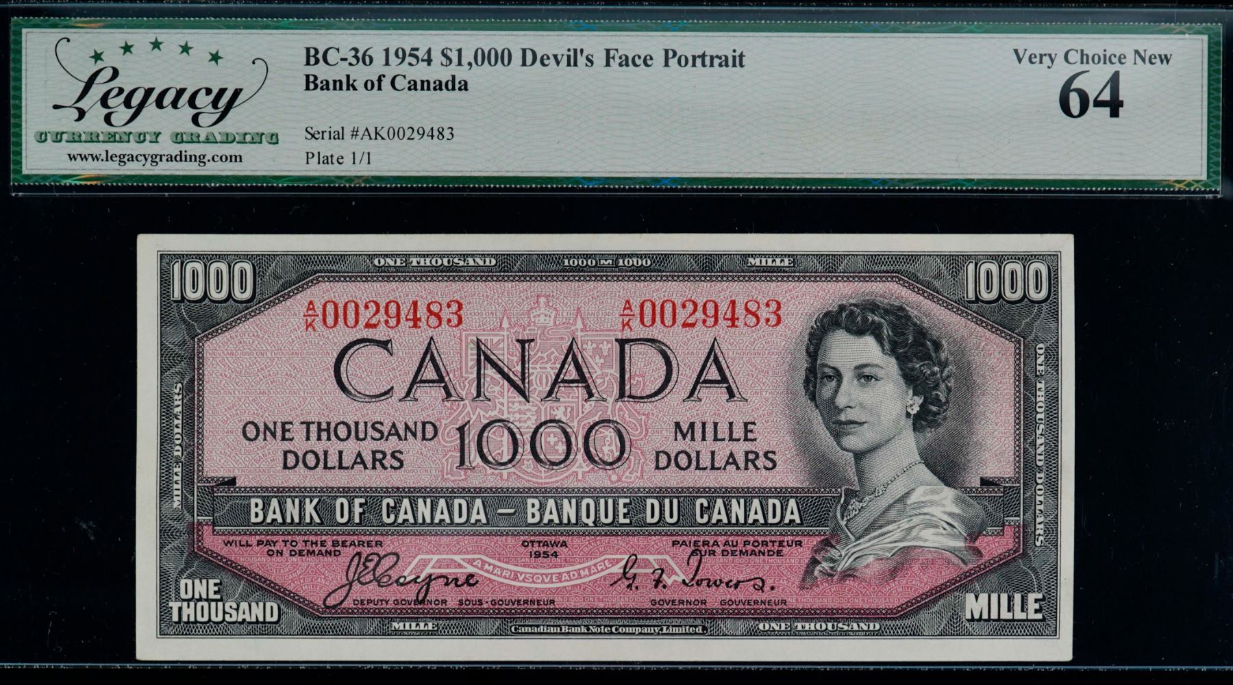 1954 $1000 BC-36 #A/K0029483 Legacy Choice Uncirculated-64. A superb example of this rare $1000 bill featuring the devil's face portrait. Nice eye appeal and good margins. This would be an important addition to a major highlight of a personal collection. Worth a premium bid. An UNC-63 brought in $23,700 at the Prominence Sale VIII.