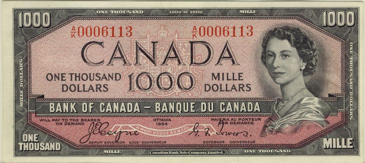 1954 $1000 BC-36 #AK0006113 PCGS AU53. Bright with vibrant colours. A very nice and well centered example.