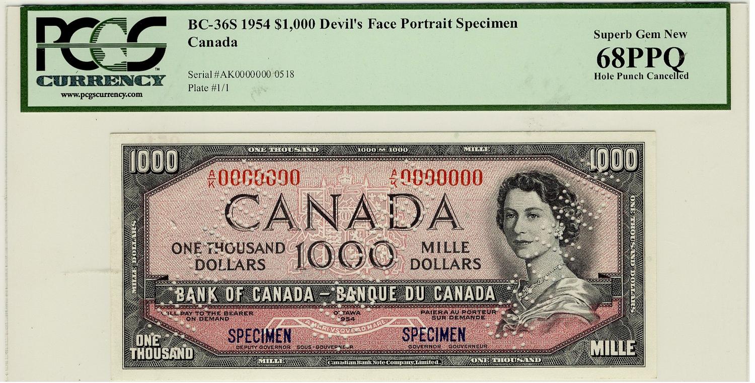 1954 $1000 BC-36S Specimen, PCGS Superb Gem UNC68PPQ. Only 7 examples known. Believed to be the finest known. Worth a premium bid.