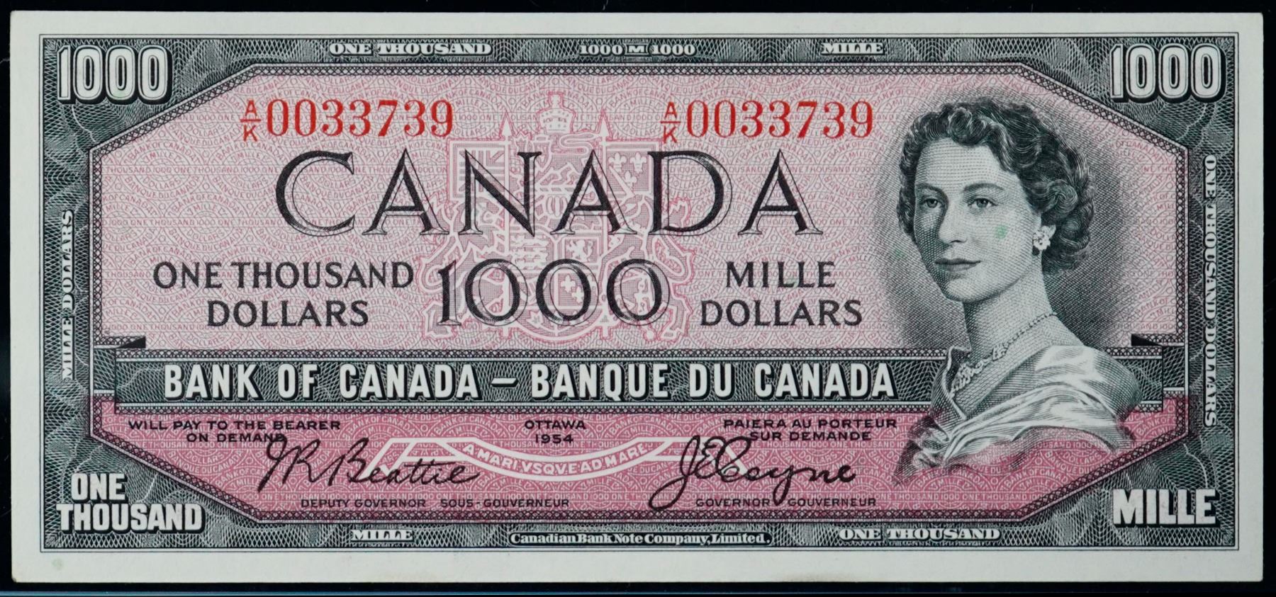 1954 $1000 BC-44a #A/K 0033739 LCG 65 PPQ. Wow! So flashy and attractive. Nice centering and embossing. Simply a splendid example, one of unforgettable quality and a highlight of this sale. Very rare this nice. A Gem-65 example sold for $17,775 In 2023 RCNA sale. Worth a premium bid.
