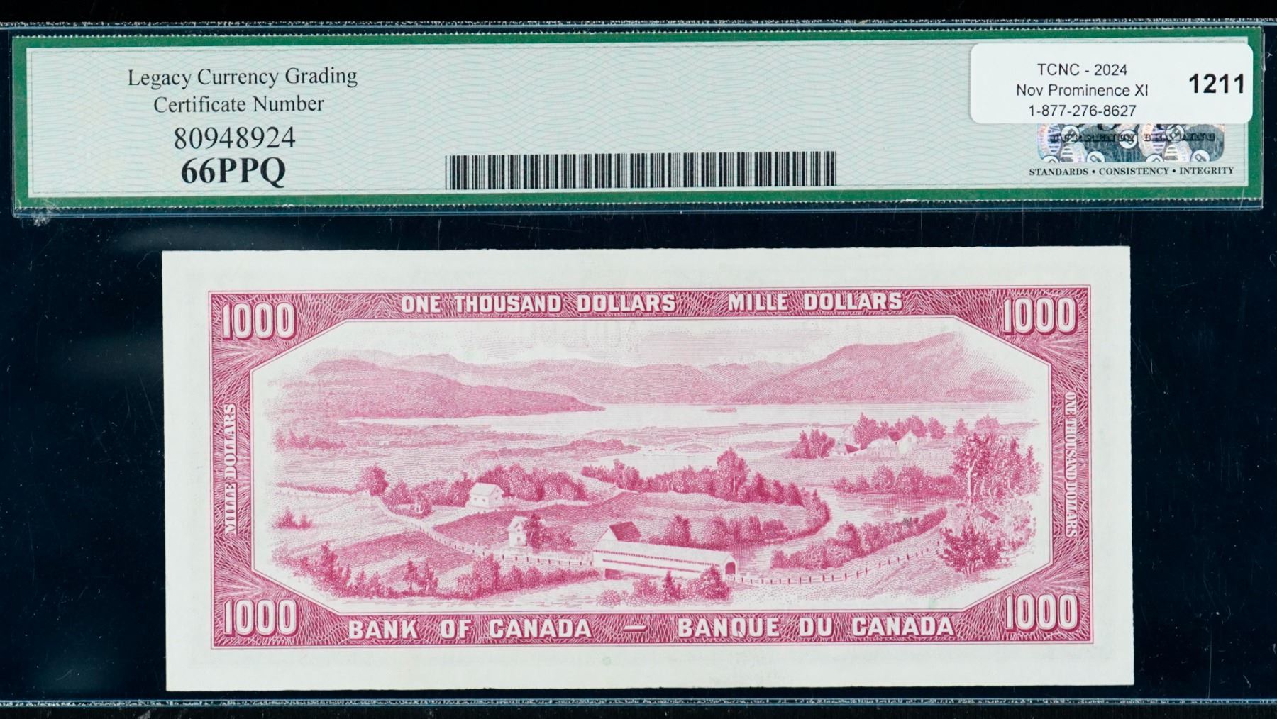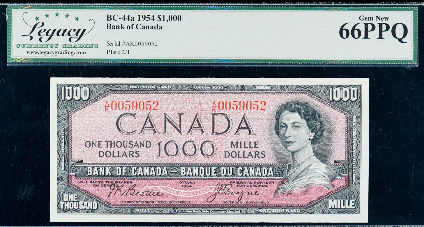 1954 $1000 BC-44a #A/K 0059052 LCG 66 PPQ. So flashy and attractive. Nice centering and embossing. Simply a splendid example, one of unforgettable quality and a highlight of this sale. Very rare this nice. A Gem-65 example sold for $17,775 In 2023 RCNA sale. Worth a premium bid.