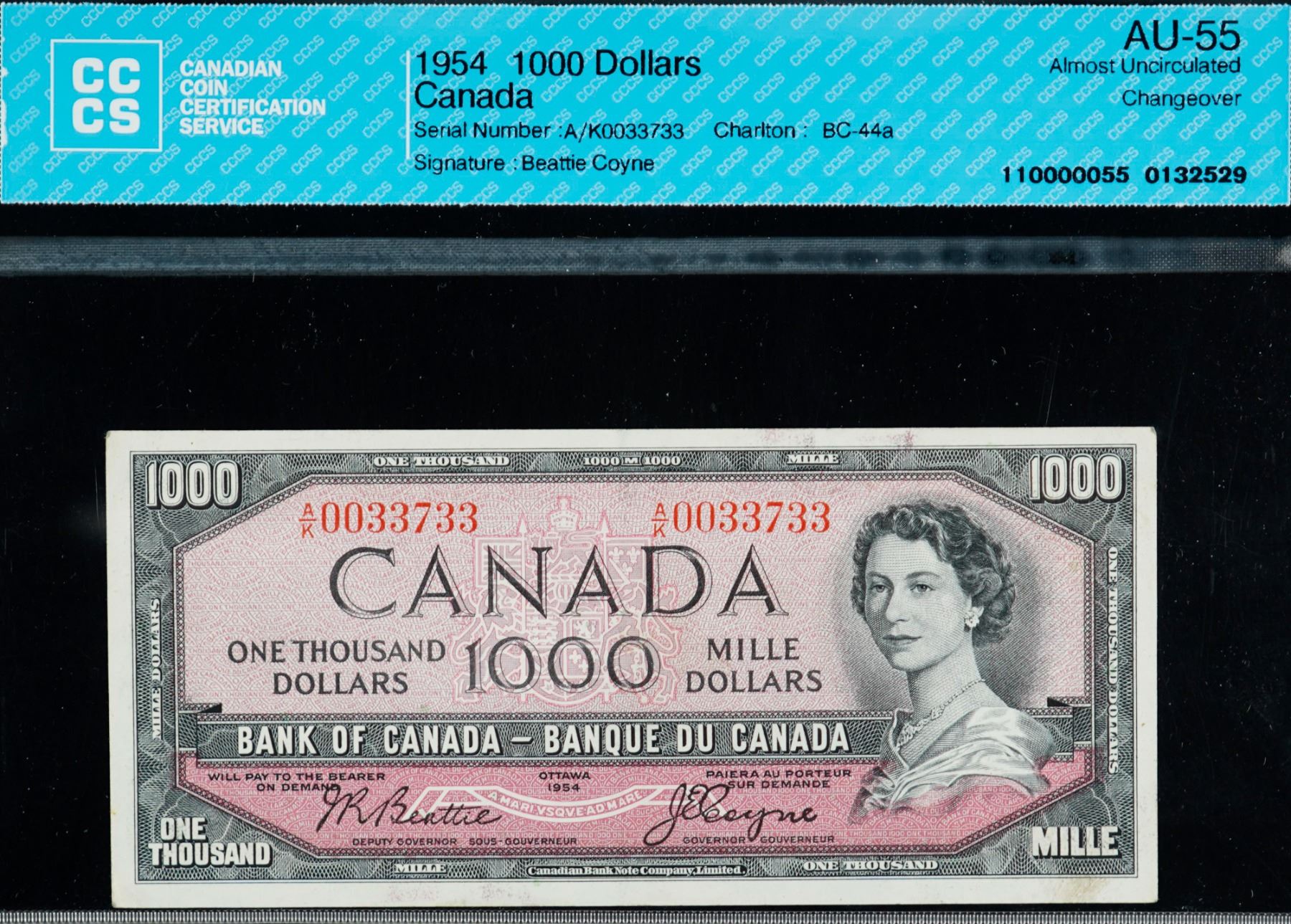 1954 $1000 BC-44a #A/K00333733 CCCS Uncirculated-60. Scarce Beattie-Coyne signatures.