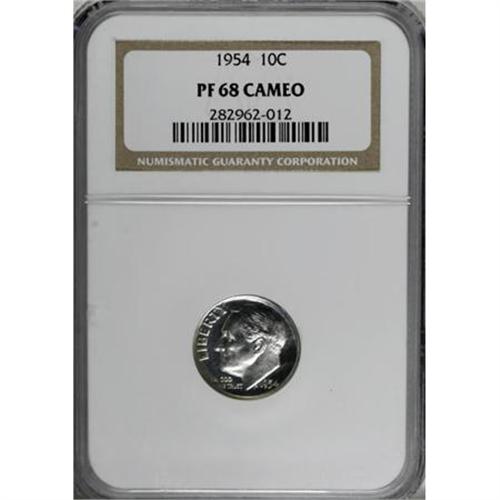<B>1954 10C PR68 Cameo NGC.</B></I> NGC Census: (101/7). PCGS Population (18/1). (#85229)<BR><BR><b>Shipping:</b> Coins & Currency (<a target="_blank" href="http://www.heritageauctions.com/common/shipping.php">view shipping information</a>)