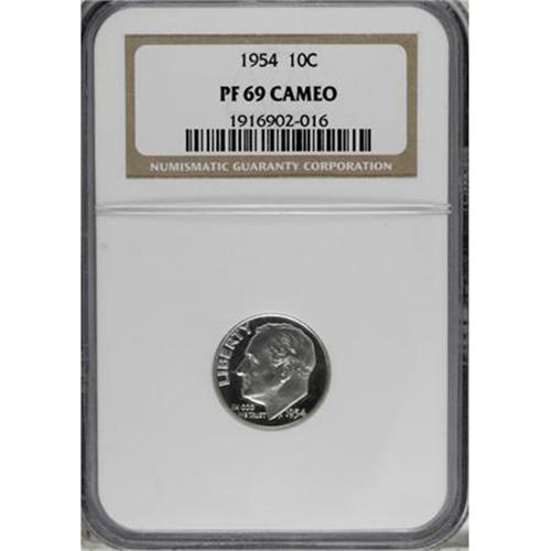 <B>1954 10C PR69 Cameo NGC.</B></I> An untoned, silvery white Cameo that is virtually flawless and razor-sharp in every detail, with fully frosted devices atop deeply reflective fields. Rick Tomaska, an expert in proof coinage of this era once wrote: "Do not pass up a 1954 proof dime with silvery white cameo devices, if you are fortunate enough to come upon one!" <BR><BR><b>Shipping:</b> Coins & Currency (<a target="_blank" href="http://www.heritageauctions.com/common/shipping.php">view shipping information</a>)