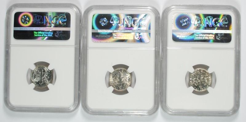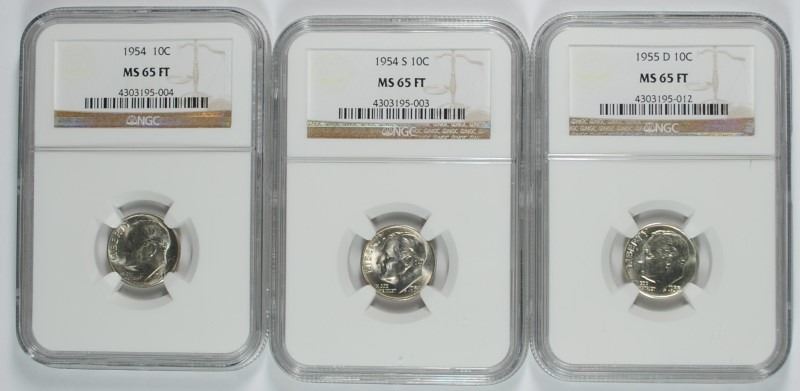 1954, 1954-S & 1955-D ROOSEVELT DIMES, NGC MS-65 FULL TORCH