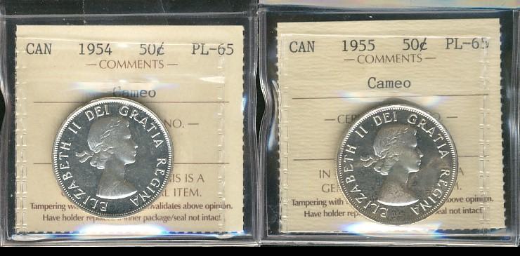 1954 & 1955 50¢ ICCS PL65 Cameo. Lot of 2 coins.