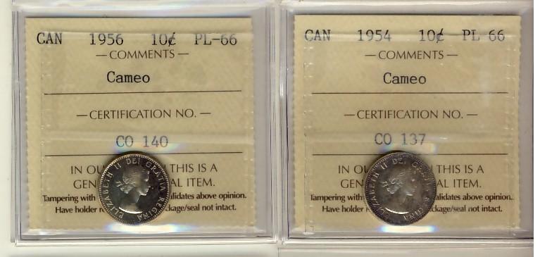 1954 & 1956 10¢ ICCS PL66 Cameo. Lot of 2 coins.