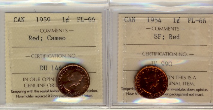 1954 & 1959 1¢ ICCS PL66RD. Lot of 2 coins, 1959 designated Cameo.