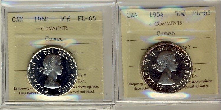 1954 & 1960 50¢ ICCS PL65 Cameo. Lot of 2 coins.