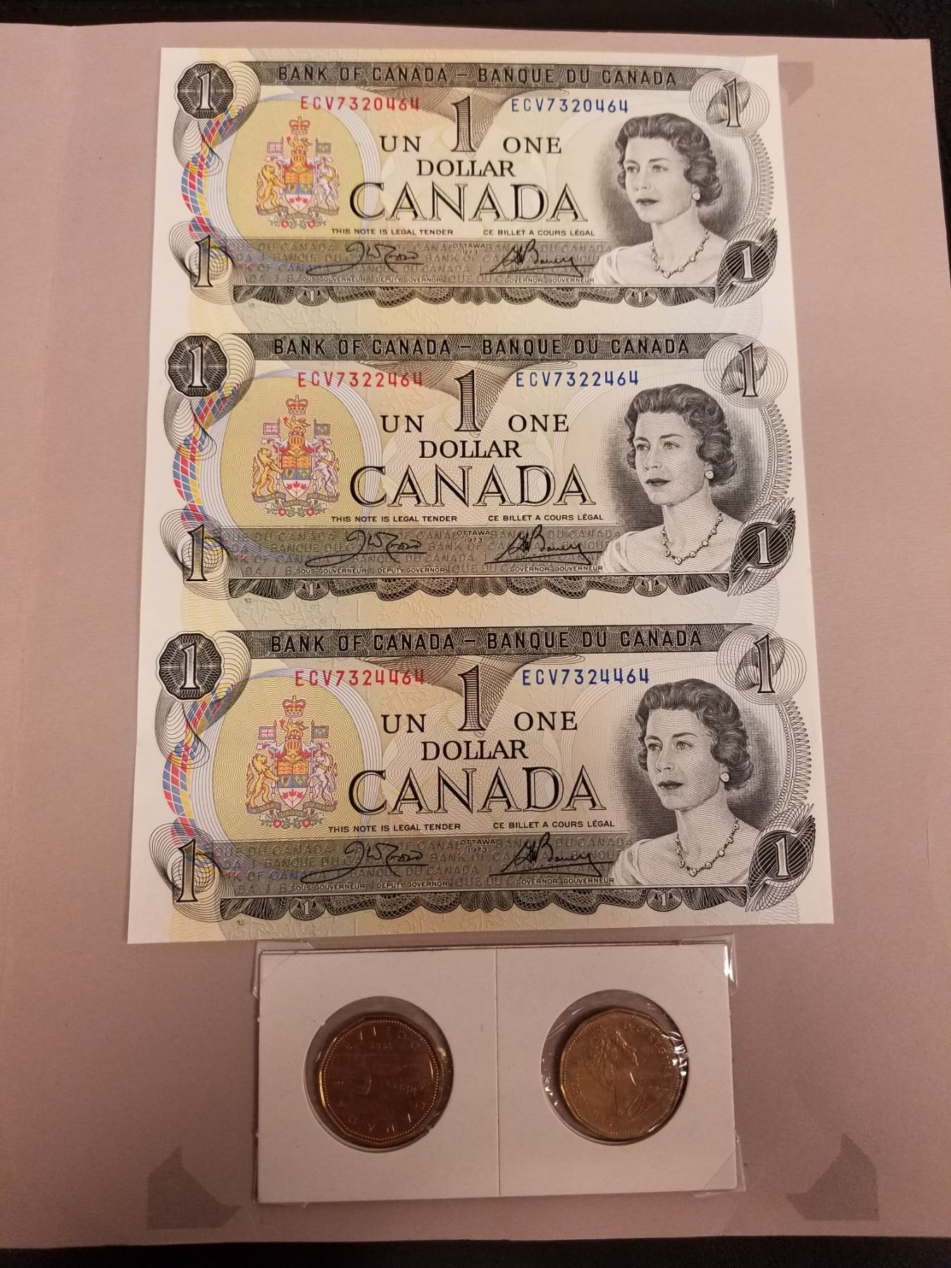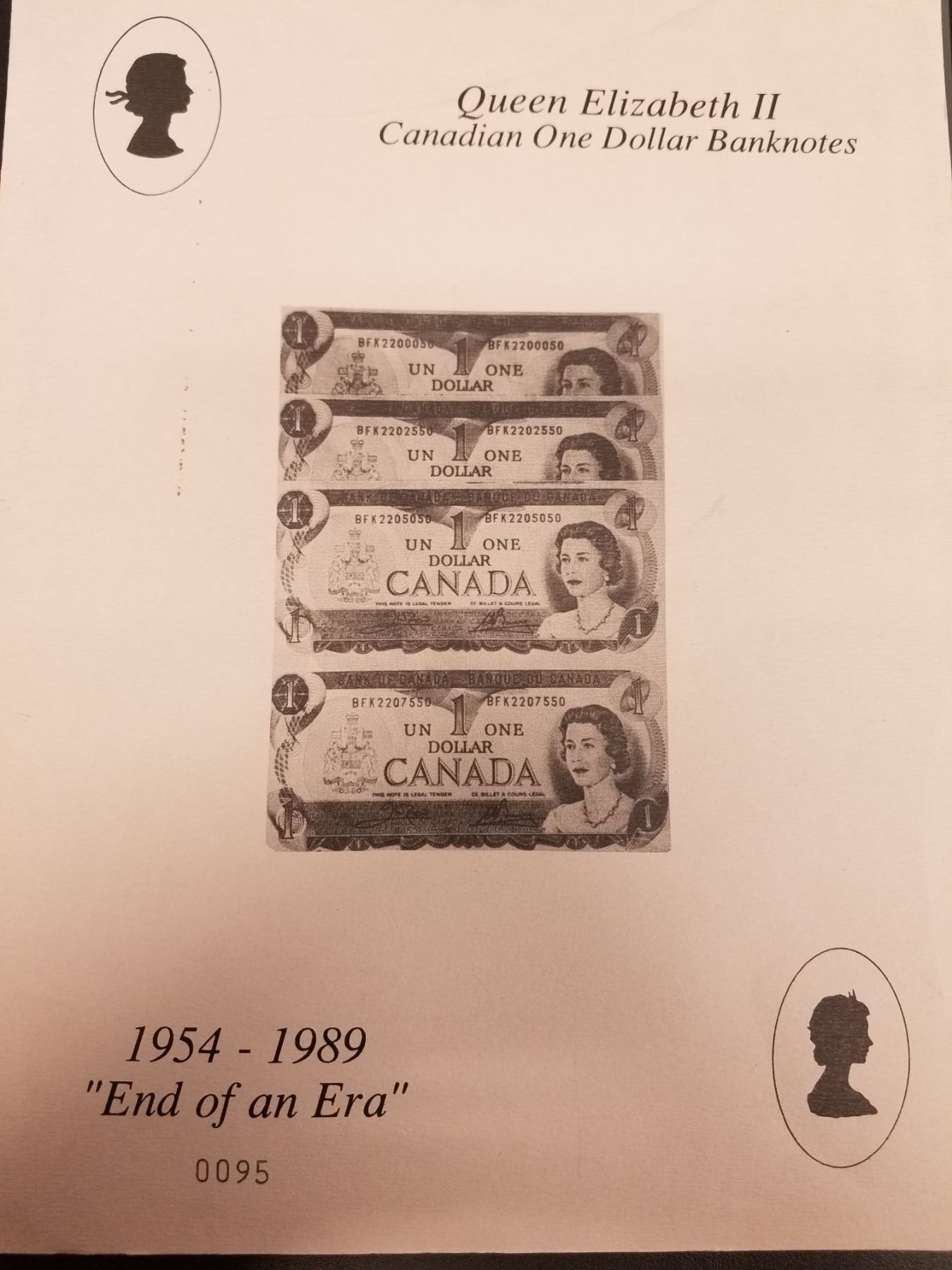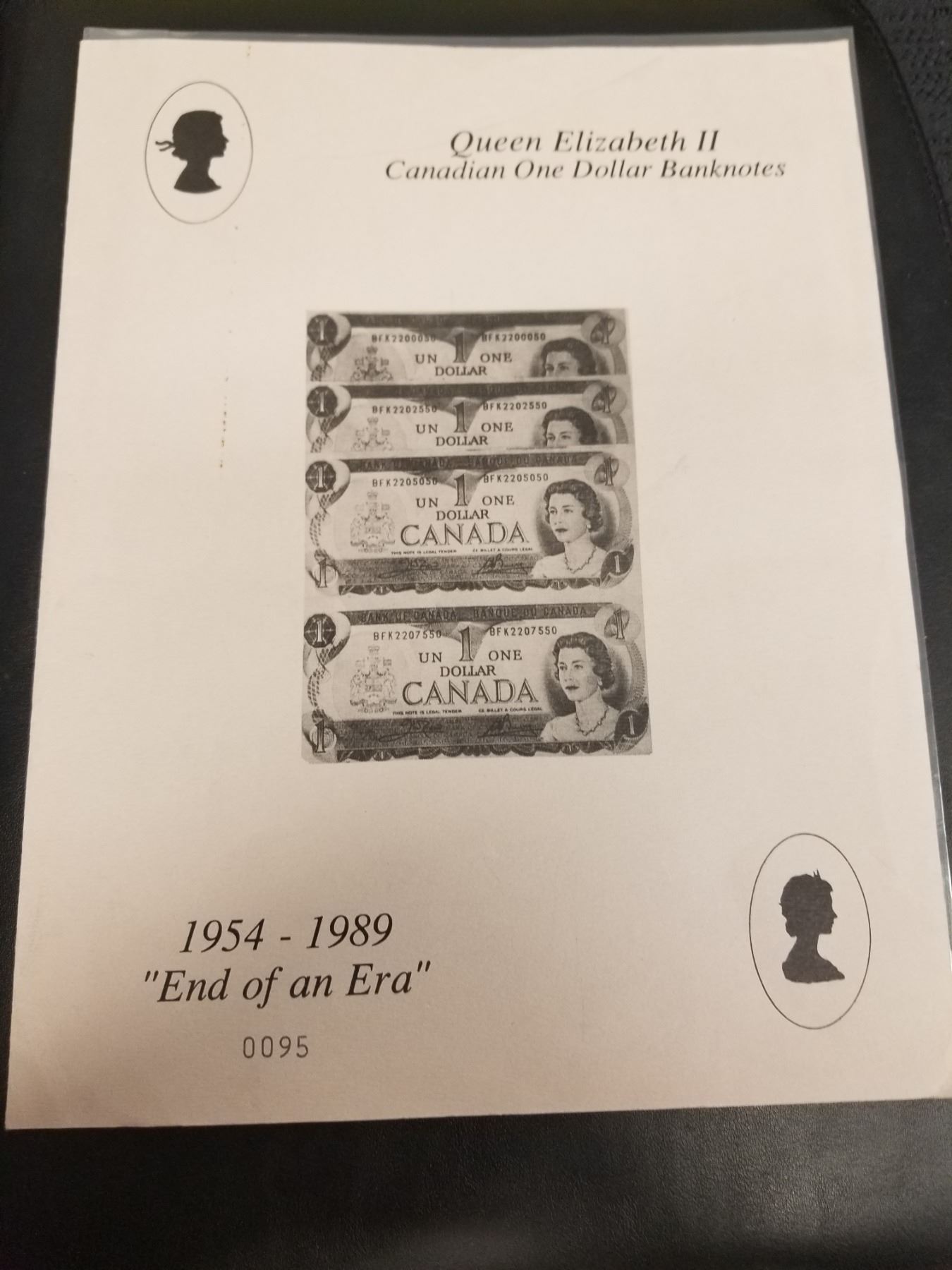 Queen Elizabeth 11 ascended the throne in 1952, initiating a new portrait for Canadian Currency. To commemorate Canada's 100th birthday a special issue of the One Dollar note was Released in 1967. two types were issued, one with regular serial numbers and the other one with the date 1867-1967. In 1973 a new note wa introduced using a much more elaborrately coloured issue. HTis series ends as of June 30 1989 with the introduction of the new Loon Dollar Coin.