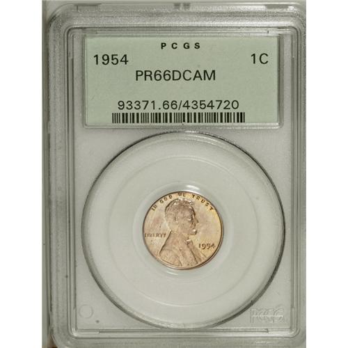 <B>1954<1C> PR66 Deep Cameo PCGS.</B></I> A piece with brilliant fields and frosty cameo devices. There are a few minuscule dots that can be found upon close inspection. Overall the coin is pleasing and worthy of the high grade it has received. Population: 10 in 66, 14 finer (8/06).