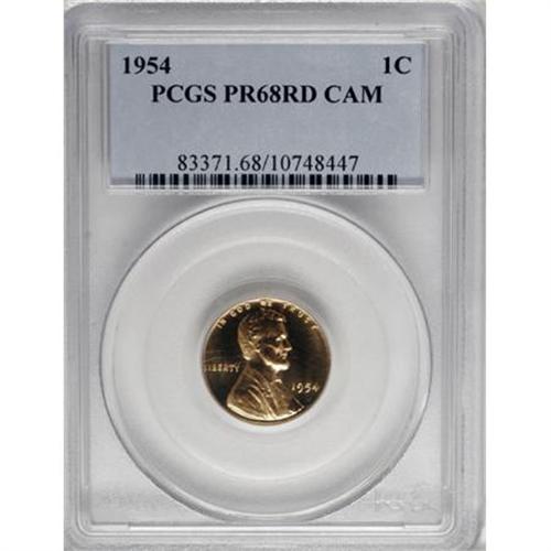 <B>1954 1C PR68 Red Cameo PCGS.</B></I> Golden-orange surfaces are nearly pristine, free of distracting ticks or spots. The unfathomable depths of the mirrored fields offer outstanding contrast with devices, and an orange-on-black appearance develops when the coin is viewed by the observer from a direct overhead angle. Population: 8 in 68 Red Cameo, 0 finer (10/07).<BR><BR><BR><b>Shipping:</b> Coins & Currency (<a target="_blank" href="http://www.heritageauctions.com/common/shipping.php">view shipping information</a>)