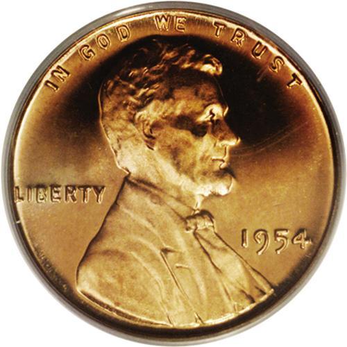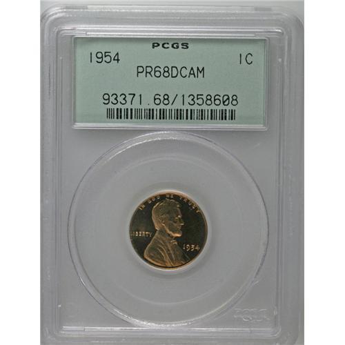 <B>1954<1C> PR68 Deep Cameo PCGS.</B></I> Pumpkin-orange radiance consumes the obverse, save for a hint of lime above the BER in LIBERTY. The reverse is consistent pale gold aside from a blush of russet along the right border. This exquisitely struck Superb Gem has particularly impressive contrast between Lincoln's portrait and the mirrored obverse field. Thorough evaluation beneath a strong lens locates only a couple of pinpoint flecks on each side, with the surfaces otherwise pristine. Proof 1954 cents are available at any local show, but examples are rare with both exemplary contrast and a carbon-free appearance. Encapsulated in an old green label holder. Population: 4 in 68 Deep Cameo, 0 finer (8/06).