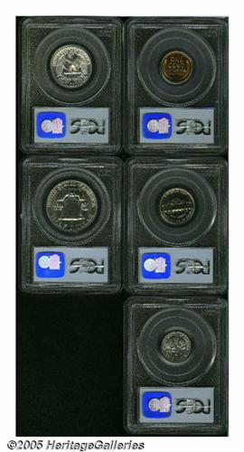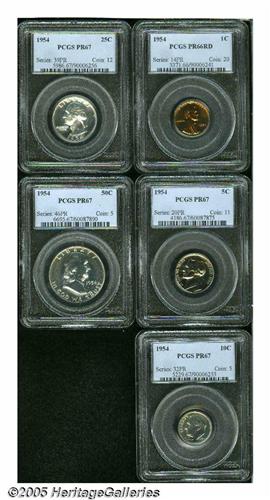 <B>1954<1C> Proof Set PR66 to PR67 PCGS.</B></I> The set includes: <B>Cent PR66 Red,</B></I> splendid canary-gold color; <B>Nickel PR67,</B></I> a good strike, delicate apricot hues; <B>Dime PR67,</B></I> well struck, a lengthy lintmark (as made) on the reverse near 9 o'clock; <B>Quarter PR67,</B></I> virtually brilliant, immaculate, traces of a retained lamination (as produced) on the left obverse field; and a <B>Half Dollar PR67,</B></I> peripheral light tan toning.