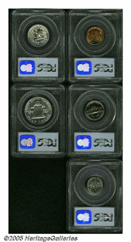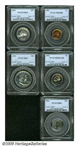 <B>1954<1C> Proof Set PR67 to PR68 PCGS.</B></I> The set includes: <B>Cent PR68 Red,</B></I> lovely yellow-gold color, a hint of rose hues on the highpoints of the portrait; <B>Nickel PR68 Cameo,</B></I> pleasing contrast, immaculate surfaces; <B>Dime PR68,</B></I> splendid quality, nearly brilliant; <B>Quarter PR68,</B></I> untoned aside from a blush of faint tan color on the upper obverse; and a <B>Half Dollar PR67,</B></I> gorgeous and virtually stone-white.