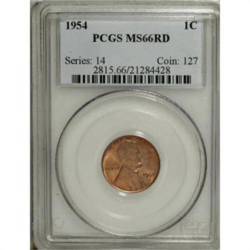 <B>1954 1C MS66 Red PCGS.</B></I> PCGS Population (183/3). NGC Census: (296/8). Mintage: 71,873,352. Numismedia Wsl. Price for NGC/PCGS coin in MS66: $100. (#2815)<BR><BR><B>Coin Engraver:</B> Victor D. Brenner<BR><BR><b>Shipping:</b> Coins & Currency (<a target="_blank" href="http://www.heritageauctions.com/common/shipping.php">view shipping information</a>)