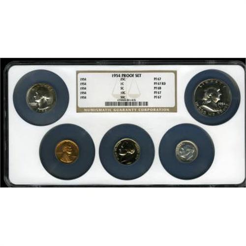 <B>1954 Proof Set Proof Set PR67 thru PR68 NGC.</B></I> The Set includes a <B>1954 1C PR67 Red NGC; 1954 5C PR68 NGC; 1954 10C PR67 NGC; 1954 25C PR67 NGC </B></I>and a <B>1954 50C PR67 NGC. </B></I>This set is encased in an NGC 5 Coin Proof Set Holder.<BR><BR><B>Coin Engraver:</B> Victor D. Brenner<BR><BR><b>Shipping:</b> Coins & Currency (<a target="_blank" href="http://www.heritageauctions.com/common/shipping.php">view shipping information</a>)
