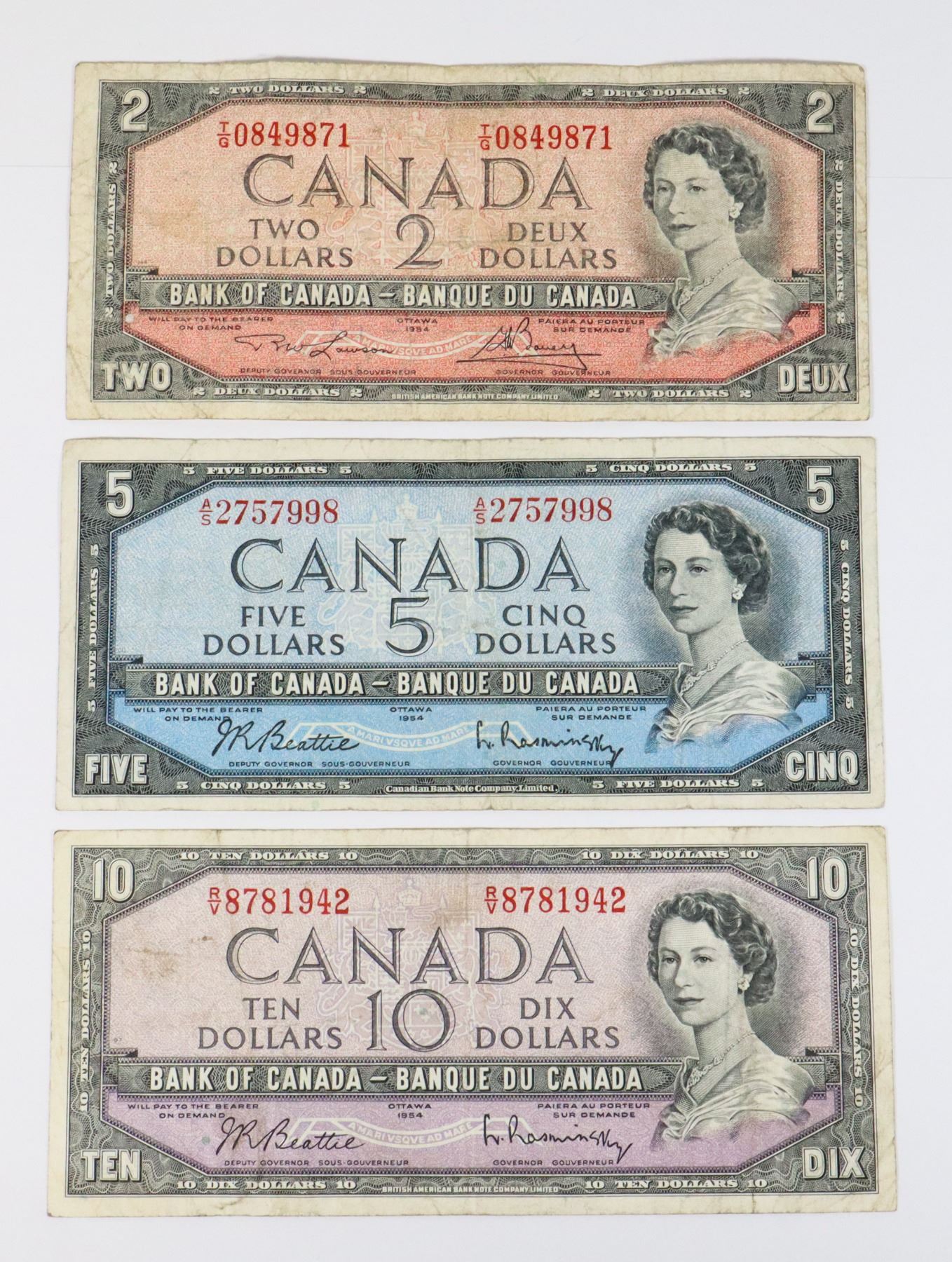 1954 $2.00, $5.00 & $10.00 BILLS 1ST Q.E.II