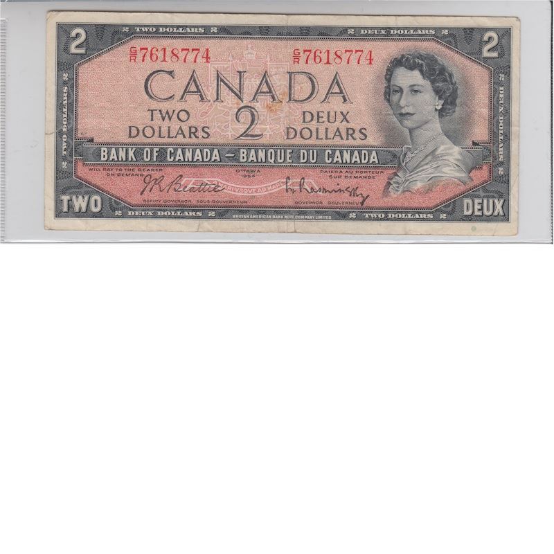 1954 $2.00 note with Prefix G/R. This note features a portrait of a young Queen Elizabeth