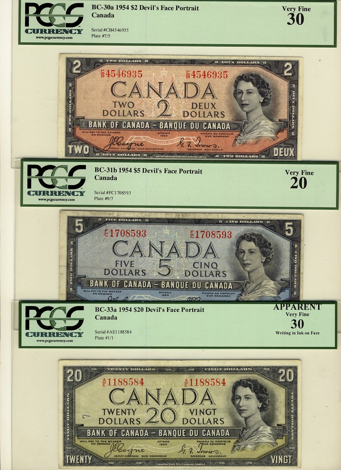 1954 $2 BC-30a, $5 BC-31b, $20 BC-33a, all PCGS VF30 except $5 PCGS VF20