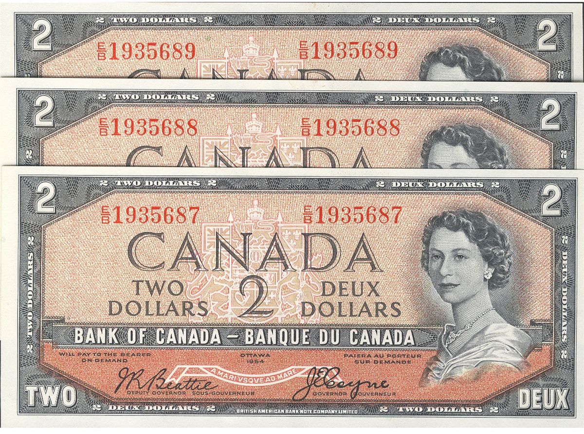 1954 $2 BC-30a #EB1935687-689. Lot of 3 consecutive Crisp fully embossed original Choice UNC notes.