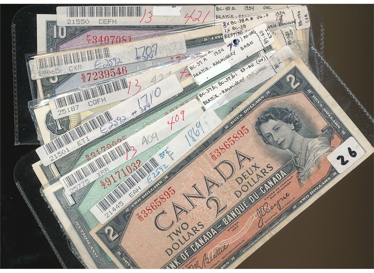 1954 $2 BC-30a VG, 1954 $1 BC-37b(8), BC-37bi(6), 1973 BC-46a(10), BC-34bA #*AB(2), BC-38a, BC-38b,