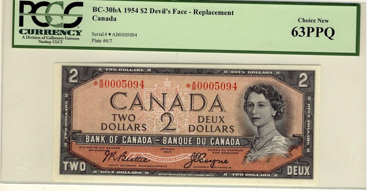 1954 $2 BC-30bA #*AB0005094 PCGS Choice UNC63PPQ. A very rare and desirable devil's face replacement note. Great colours and good centering.