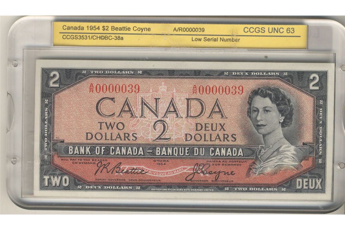 1954 $2 BC-38a LOW SERIAL #:A/R0000039 CCGS UNCIRCULATED-63.