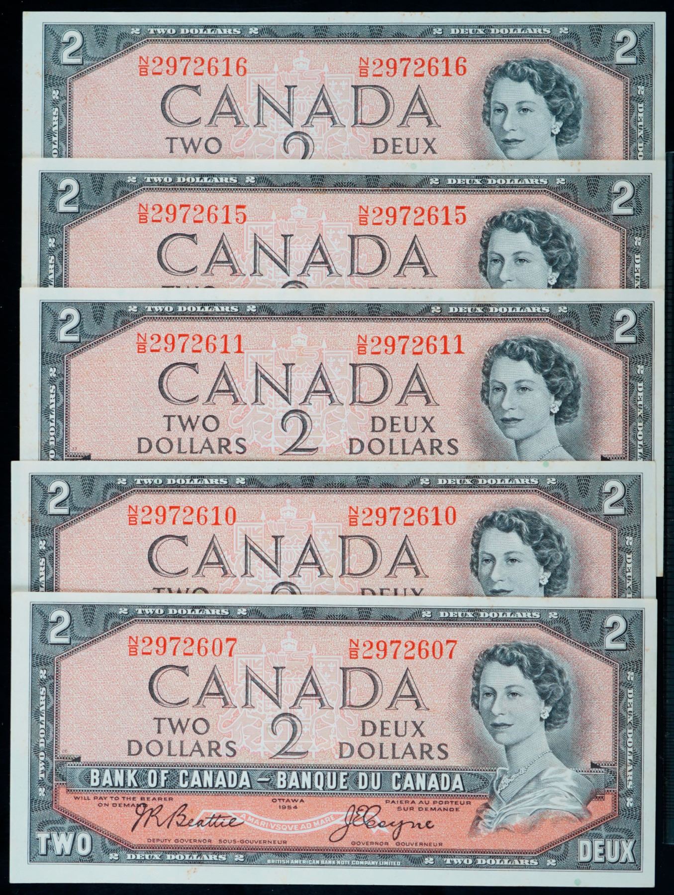 1954 $2 BC-38a #N/B Beattie-Coyne. Lot of 5 notes in Uncirculated or better.
