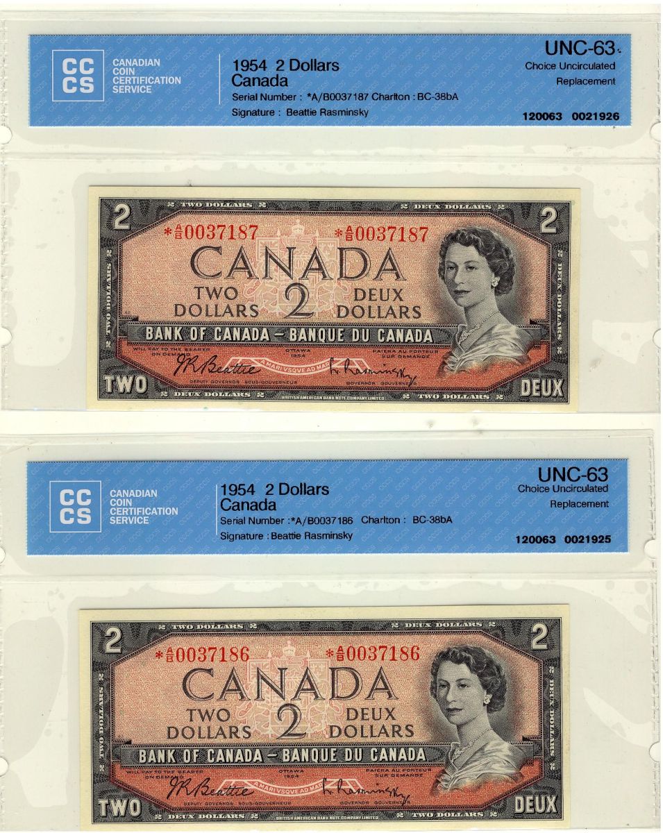 1954 $2 BC-38bA *A/B0037186/87 CCCS UNC63. A nice consecutive pair