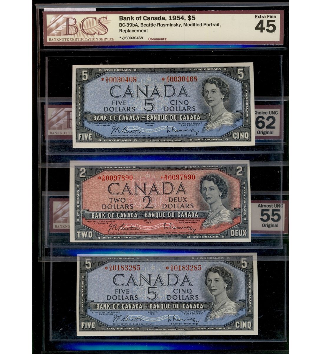 1954 $2 BC-38bA #*AB0097890 UNC62, $5 BC-39bA #*VS0030468 EF45 & #*SS0183285 AU55. Lot of 3 BCS graded notes.