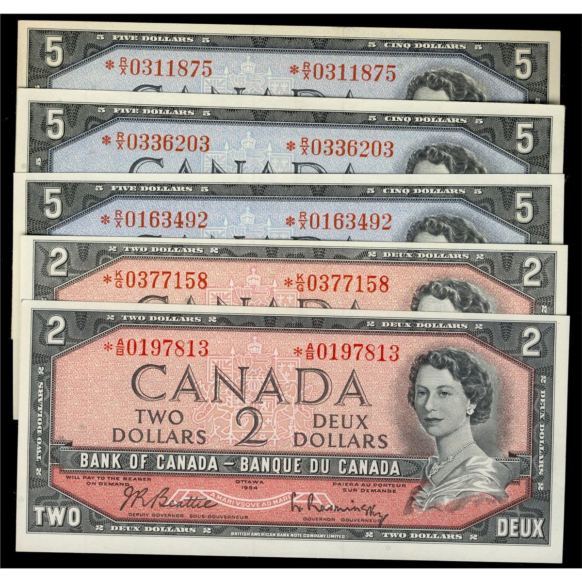 1954 $2 BC-38bA #*AB0197813, BC-38dA #*KG0377158, $5 BC-39cA #*RC(3). Lot of 5 replacement issues EF to UNC.