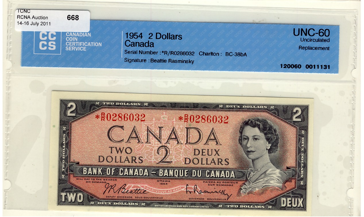 1954 $2 BC-38bA *R/R0286032 CCCS UNC60. A rare replacement.