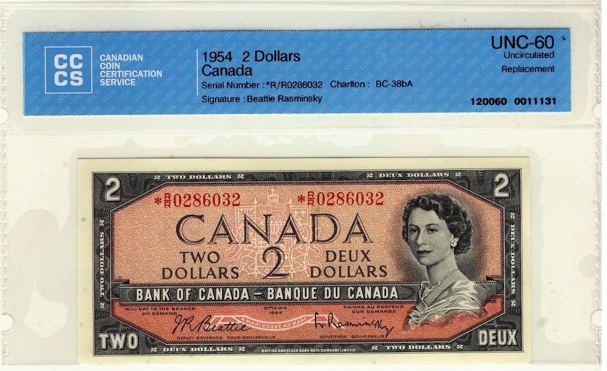 1954 $2 BC-38bA *R/R0286032 CCCS UNC60. A rare replacement.