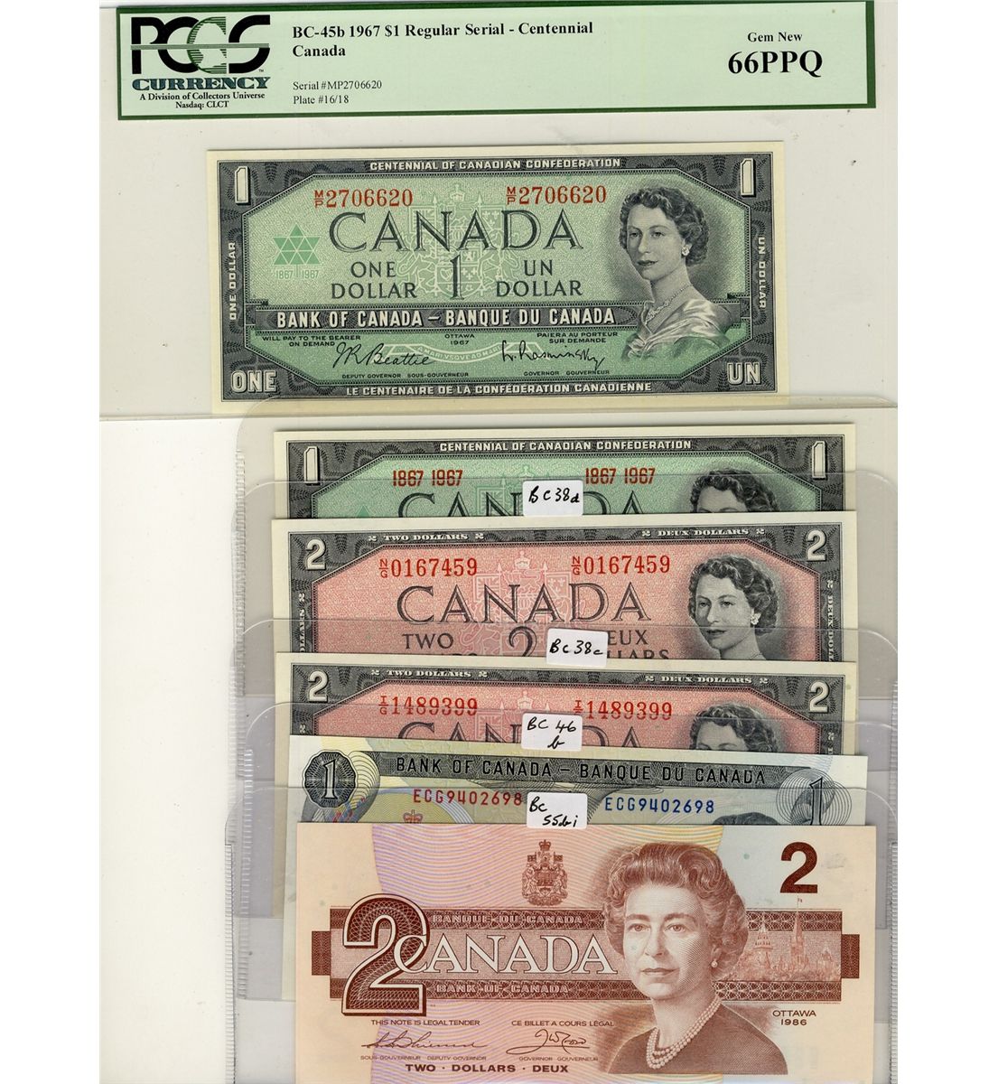 1954 $2 BC-38c, BC-38d, 1967 $1 BC-45a, 1973 $1 BC-46b, 1986 $2 BC-55b-i all UNC & 1967 $1 BC-45 PCG