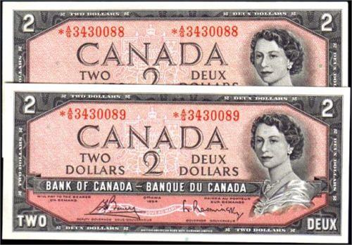 1954 Two Dollars Bouey-Rasminsky, BC-38cA, two consecutive serial numbers *A/G3430088 and A/G3430089, both Uncirculated