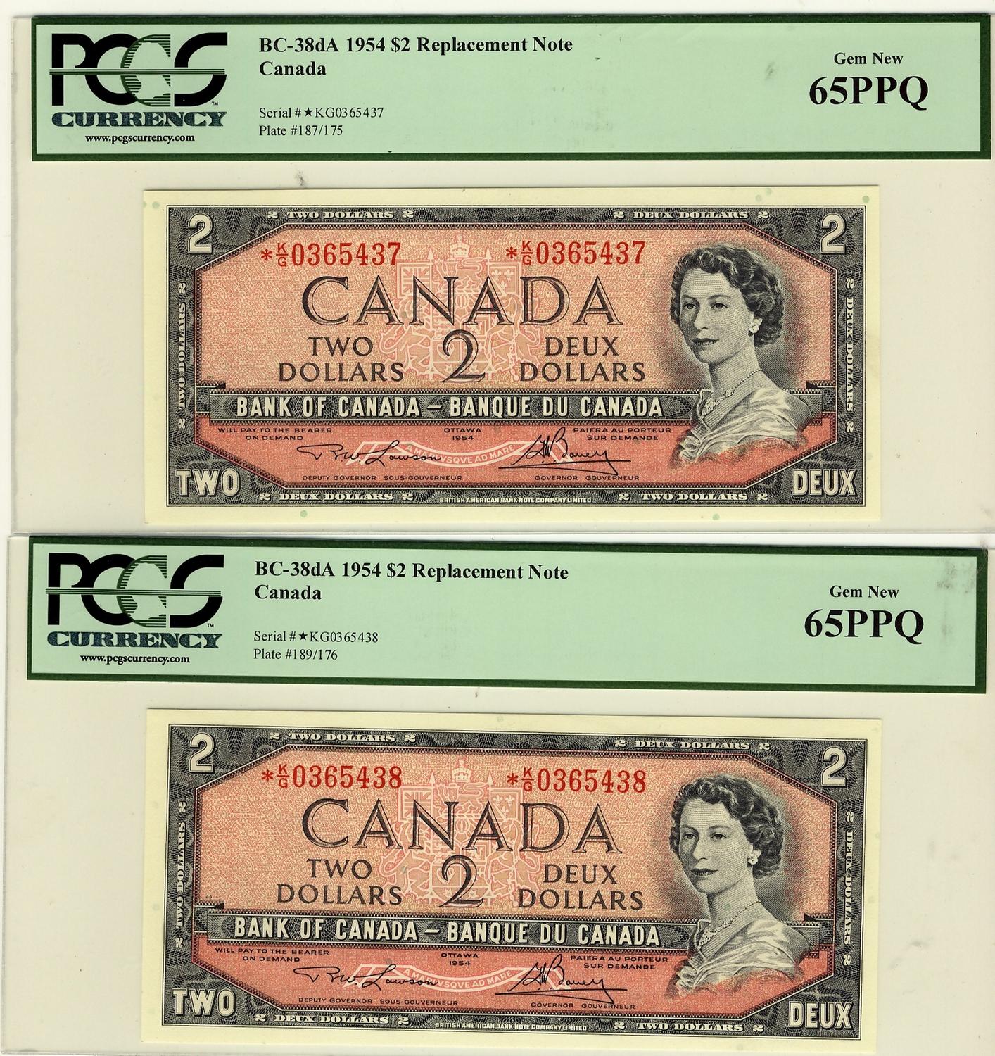 1954 $2 BC-38dA #*KG0365437- 438 PCGS Gem UNC65PPQ. Lot of 2 notes.