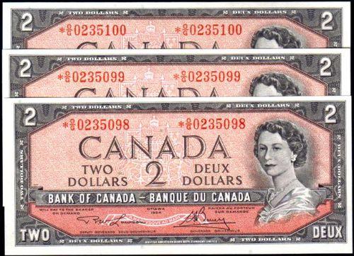 1954 Two Dollars Lawson-Bouey, BC-38dA, three consecutive serial numbers *O/G0235098 to *O/G0235100, all Uncirculated