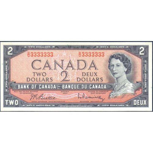 1954 Two Dollars Beattie-Rasminsky, BC-38b Solid Serial Number D/U3333333, PMG Gem Uncirculated 66 Exceptional Paper Quality