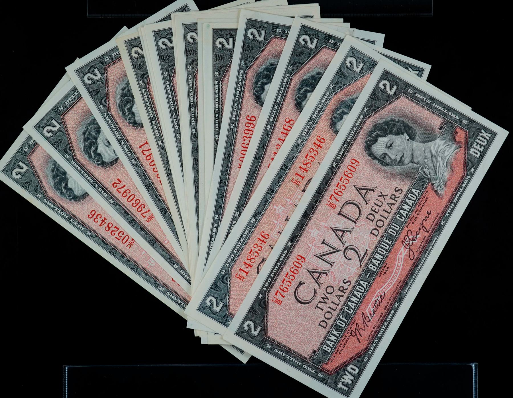1954 $2 Lot; Includes Various signatures and better prefix. All EF to Unc, Lot of 19 notes.