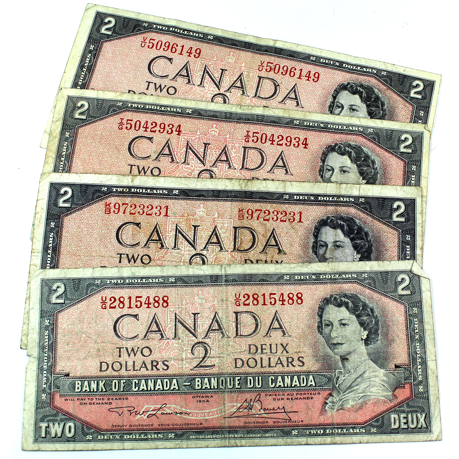 INCLUDES: BC-38d Lawson-Bouey SN: U/G2815488, BC38a Beattie-Coyne SN: K/B9723231, BC38c Bouey-Rasminsky SN: I/G5042942934, & BC-38b Beattie-Rasminsky SN:V/U5096149. 4pcs.